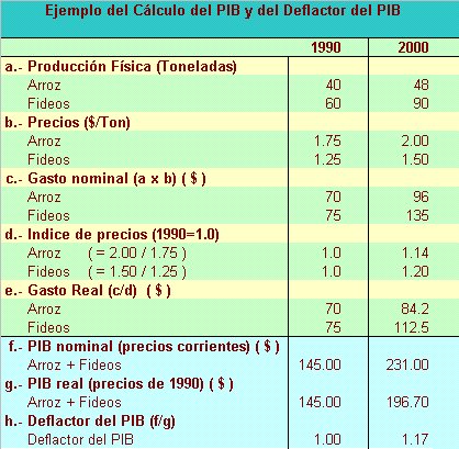 En este ejemplo, el gasto nominal se obtiene al multiplicar el precio del bien por su producción física. Para obtener el gasto real, en cambio, debemos calcular el índice de precios correspondientes a 1990 y al año 2000, esto se consigue dividiendo el precio (b) del bien en el año 2000 por el precio del mismo bien en el año 1990. El gasto real corresponde al gasto nominal dividido por el índice de precios.